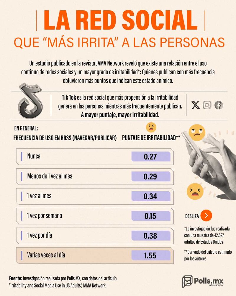 No obstante, una investigación de Polls MX sobre un artículo de JAMA Network reveló que mientras más frecuentes son las publicaciones en redes sociales, mayor es la irritabilidad que se genera entre los internautas.