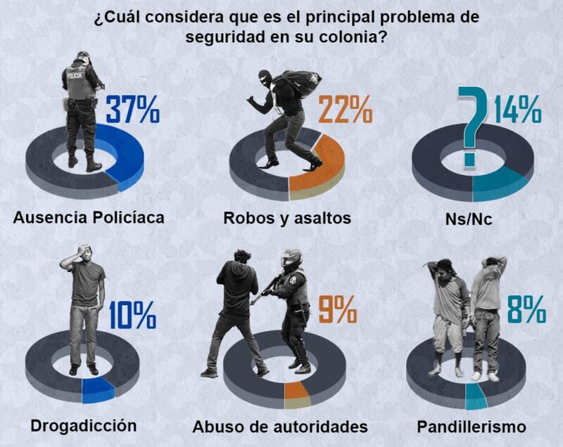 De acuerdo con la encuesta, 37% señaló la ausencia de policías como la principal problemática, mientras que los robos y asaltos quedaron en segundo lugar, con un 22%.