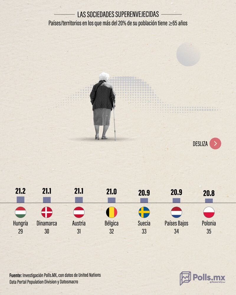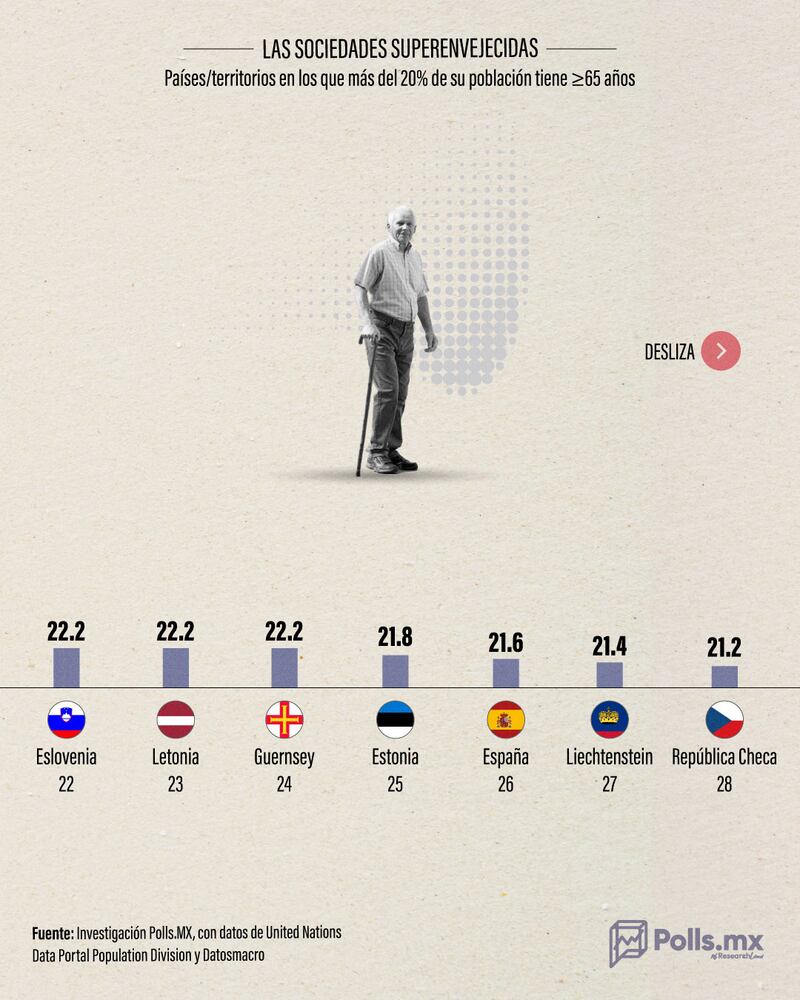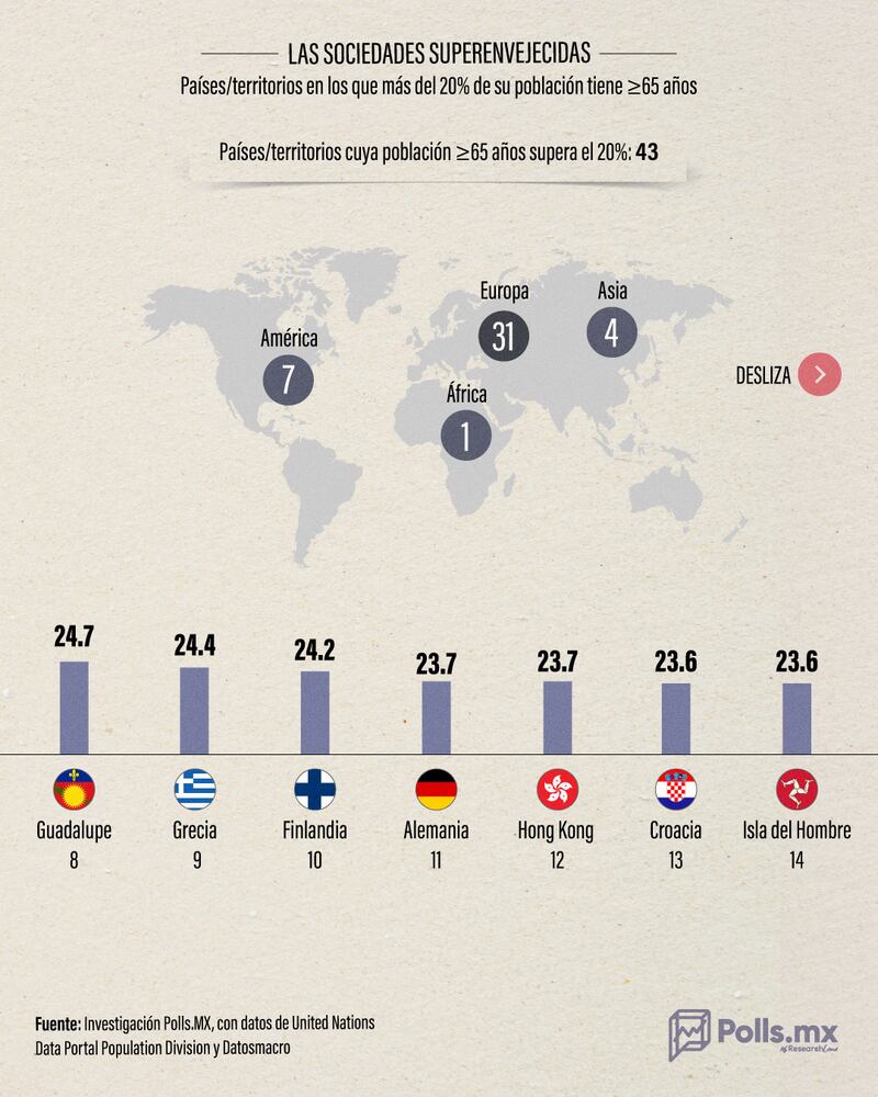 De acuerdo con datos de United Nations Data Portal Population Division y Datosmacro, en 43 países del mundo, la población de personas de 65 años o más supera el 20% de la población total.