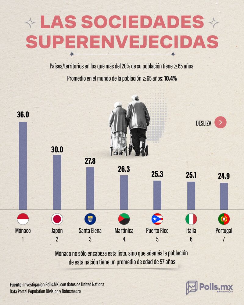 Quien ocupa el primer lugar es Mónaco, donde el 36% de su población tiene 65 o más. Cabe señalar que solo en Mónaco la población tiene un promedio de edad de 57 años.
