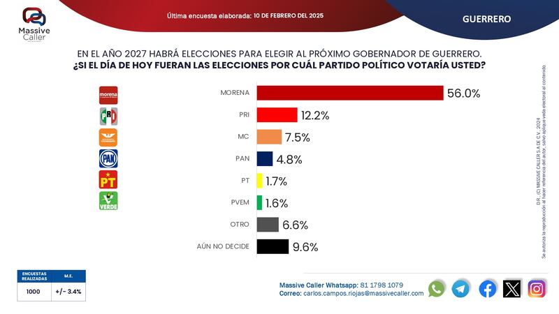 En 2027 habrá elecciones en distintos estados del país, uno de ellos es Guerrero, donde las preferencias electorales posicionan a Morena como el “favorito”, con una amplia ventaja frente al PRI, de acuerdo con la encuesta realizada por Massive Caller.