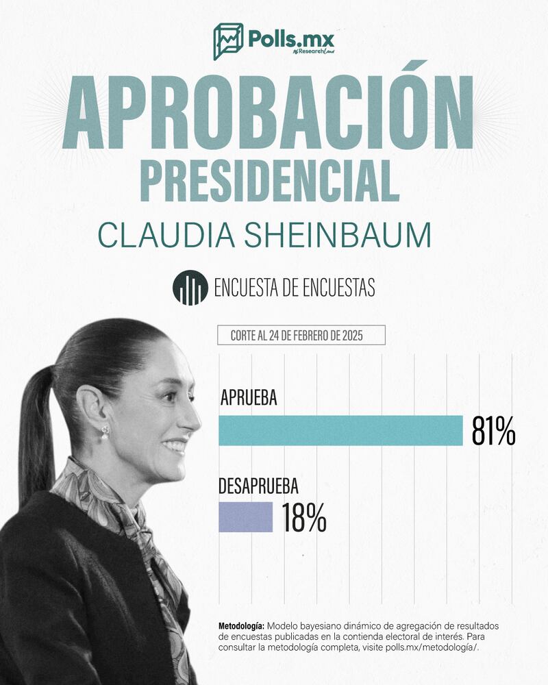 Según la última medición realizada por Polls MX, con corte al 24 de febrero de 2025, la gestión de Claudia Sheinbaum cuenta con una aprobación del 81%.